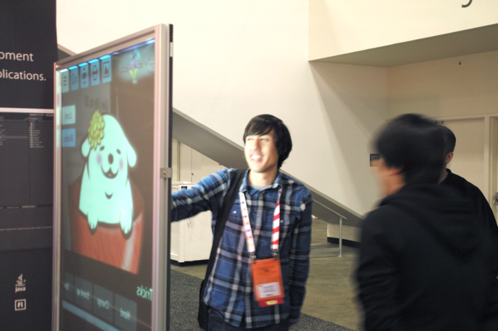 3月のGDCに続き、7月に開催されたプロダクションEXPO、8月に開催されたCEDECでも全高2.1m、82インチの巨大タッチパネル(自作!)を使ってインタラクティブなLive2Dのキャラクターを展示しました。画面にタッチするだけで5つのキャラクターを切り替えたり、各キャラクターの服(テクスチャー)をパパパっと着せ替えたりできます。もちろん、キャラクターに触れてLive2Dならではの滑らかな動きを見て楽しむ事もできます。