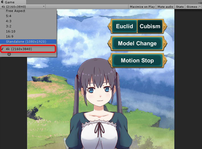 UnityのGameビューでは4K用の設定をしましょう(2160 x 3840)